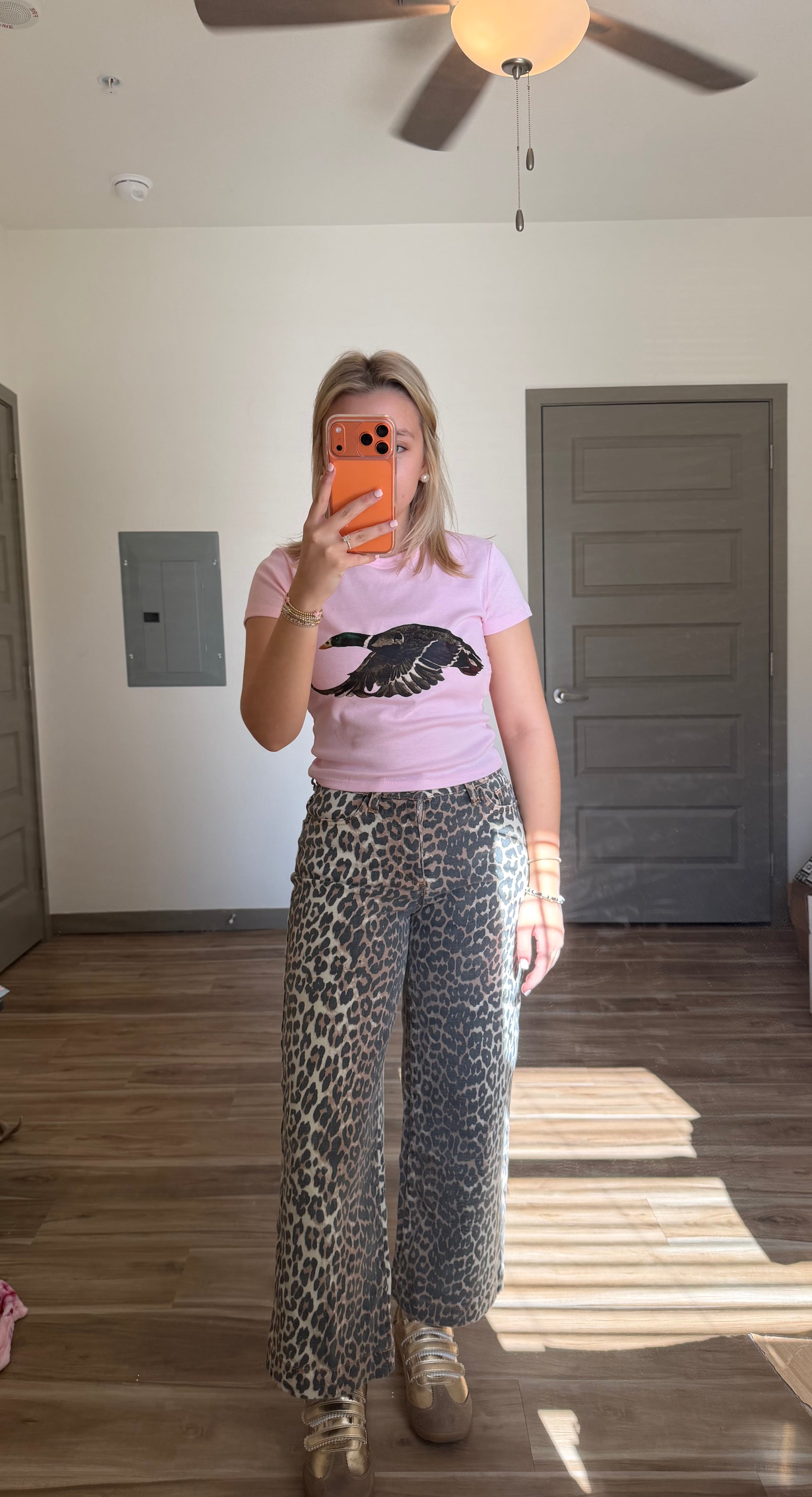 This is the pink one!! This is a preorder the tat is around three weeks! Iโm wearing size small these are a tighter fit like my duck tanks size up for a looser fit!ย